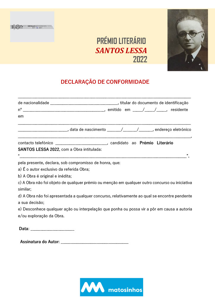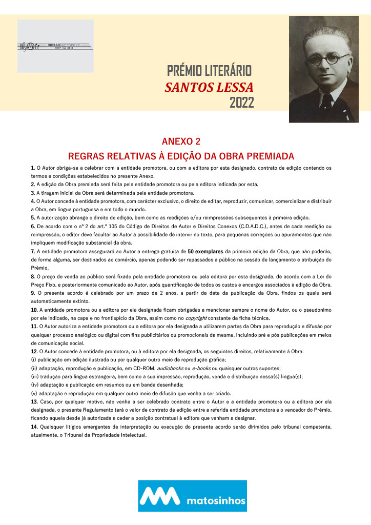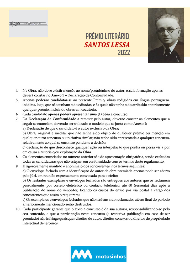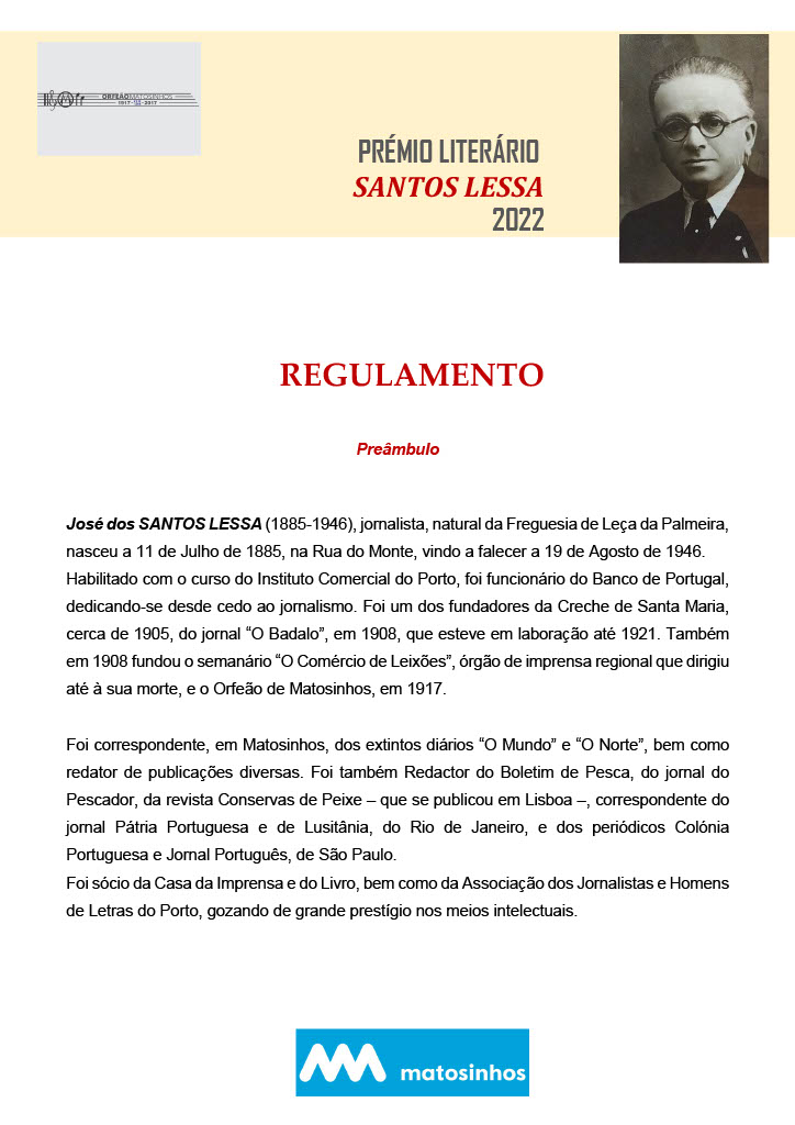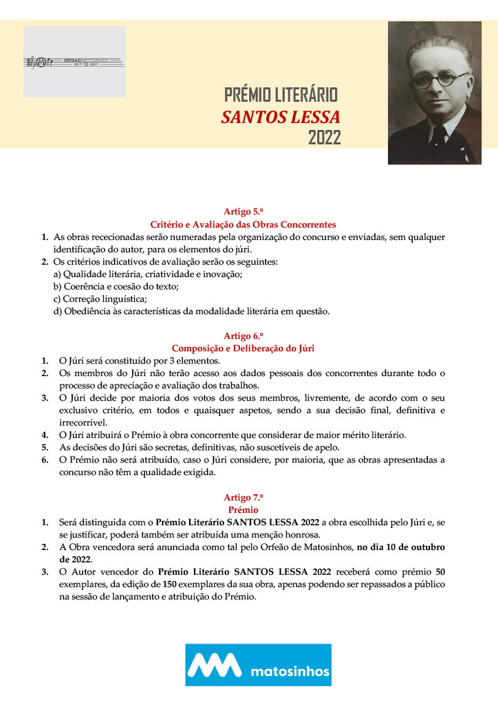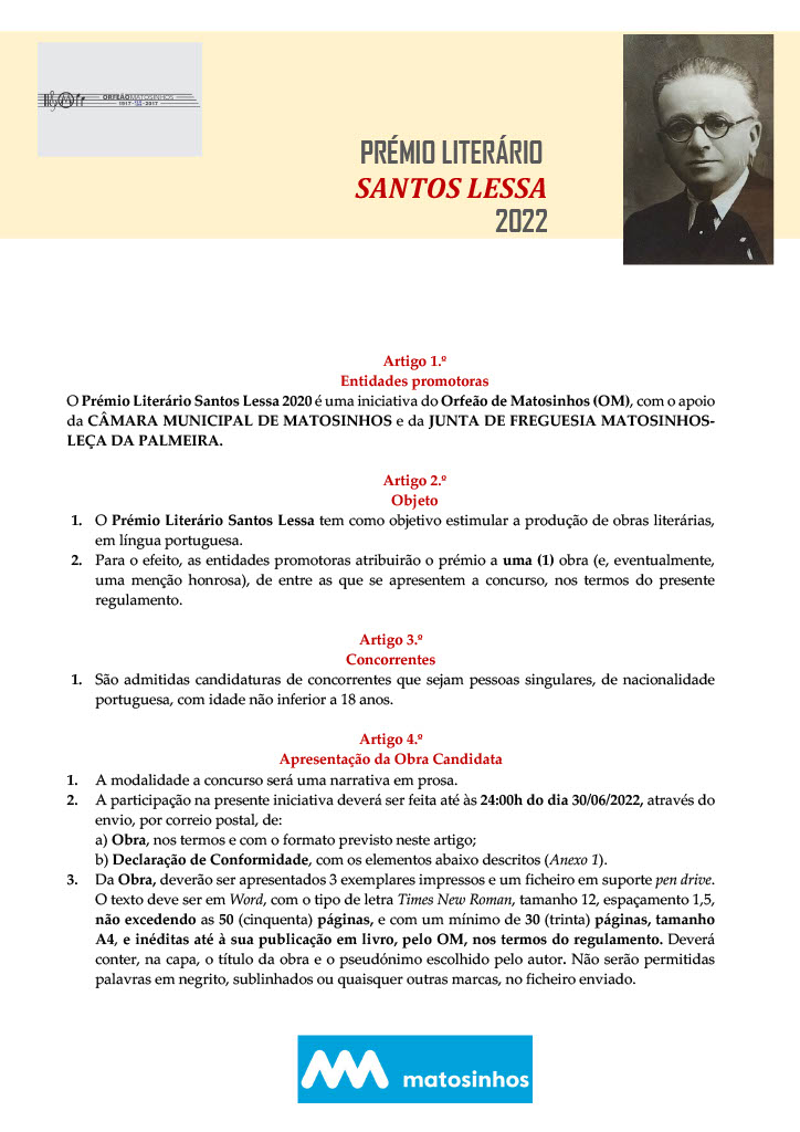 O Prémio Literário Santos Lessa 2022, é uma iniciativa do Orfeão de Matosinhos em colaboração com a Câmara Municipal de Matosinhos e a Junta de Freguesia Matosinhos-Leça da Palmeira.